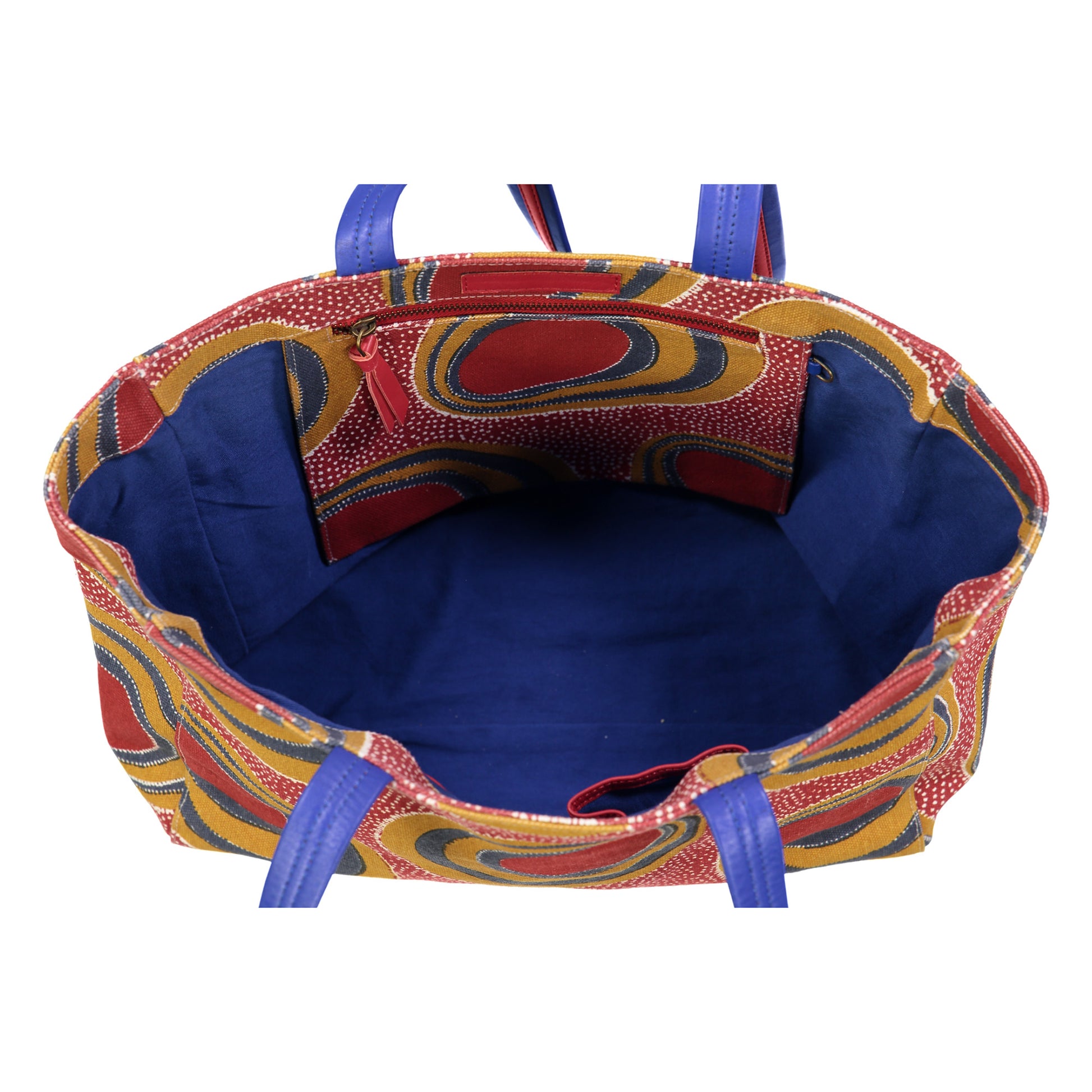 - Blue and red contrasting lambskin handles