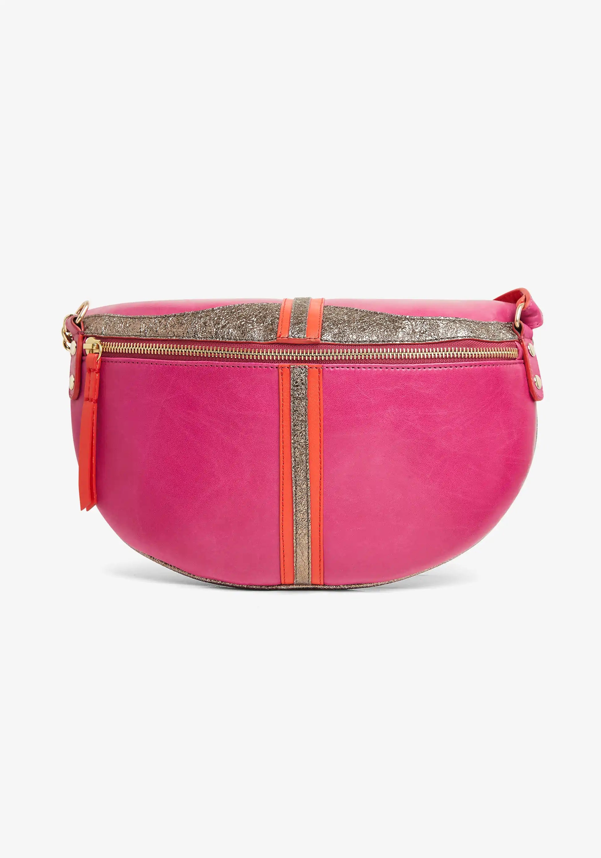 - Banane en cuir agneau brillant fuchsia, métallique bronze et en cuir de vachette rouge vermillon