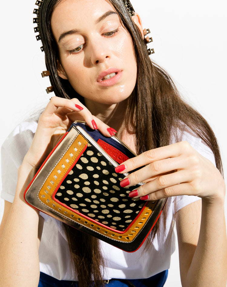 - Pochette en cuir de buffle avec motif et bordé d'un piping ton sur ton